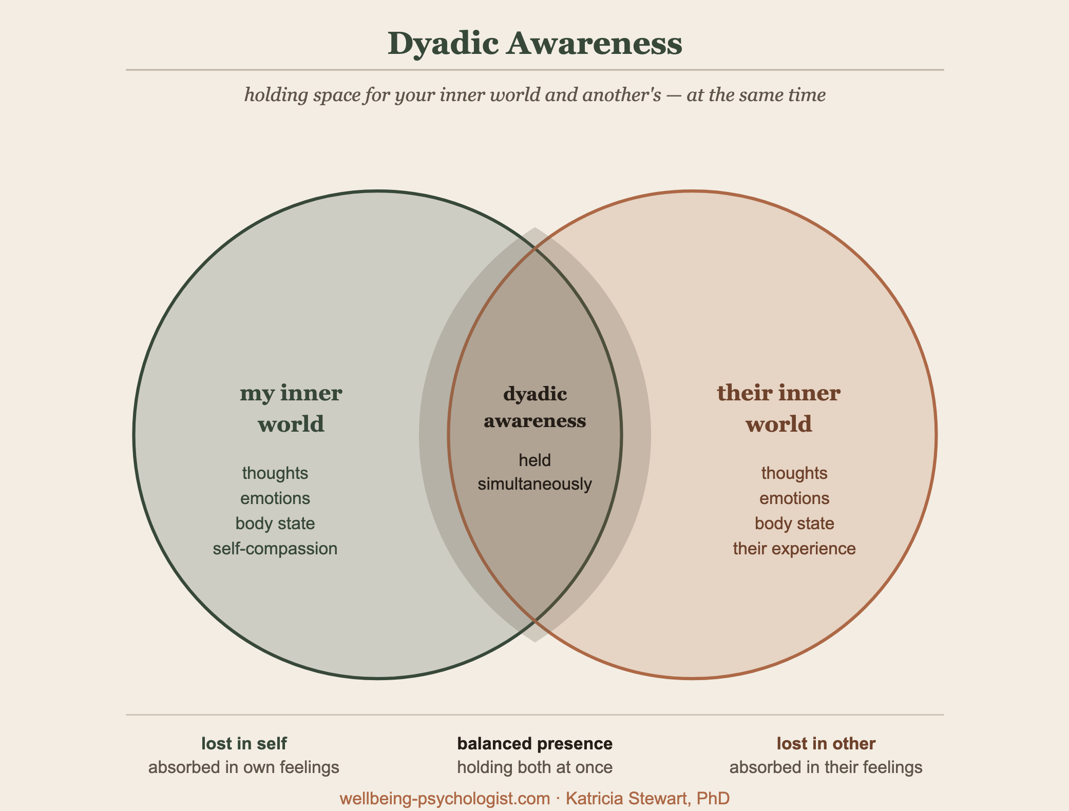 Dyadic awareness is the ability to be aware of our own internal world (e.g., thoughts and emotions) while simultaneously being aware of another person’s internal world. Can you hold space for both your own emotions and another’s emotions at the same time?